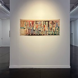 A group of women socializing in the nude, other women gazing ahead, figures that seem caught in dialogue with an unseen presence, and a single recurring male figure walking— these elements compose Boyan’s new exhibition. The paintings resemble moments lifted from scenes of an old European film, with stylized characters seemingly torn, in the very moment, from a dense narrative. The figures, slightly blurred, stand at the center of the painting; most are painted against backgrounds devoid of landscape markers, their presence expressive and full of vitality.